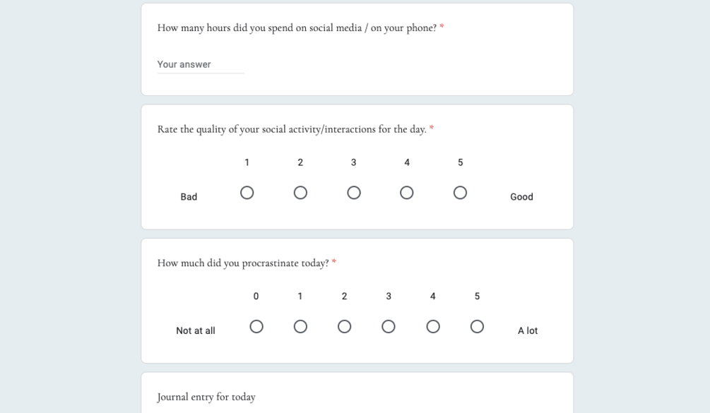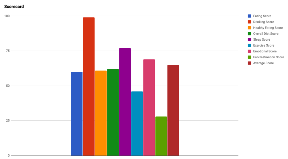 Fill it out every day - it tracks your meals, work+procrastination, how you feel day to day, exercise, etc. in a form, and then the responses are collated in a spreadsheet which generates scores and charts for different areas of your life. I've also added a journalling function which can serve as a mini diary,